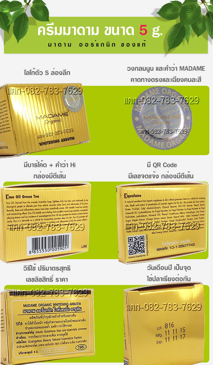ครีมมาดาม ออร์แกนิก : ขนาด 5 กรัม แพคเกจใหม่ครีมมาดาม ออร์แกนิก : ไวท์เทนนิ่ง อาร์บูติน ขนาด 5 กรัมปัจจุบันกล่องเปลี่ยนใหม่ สวยงามน่าใช้มากค่ะ